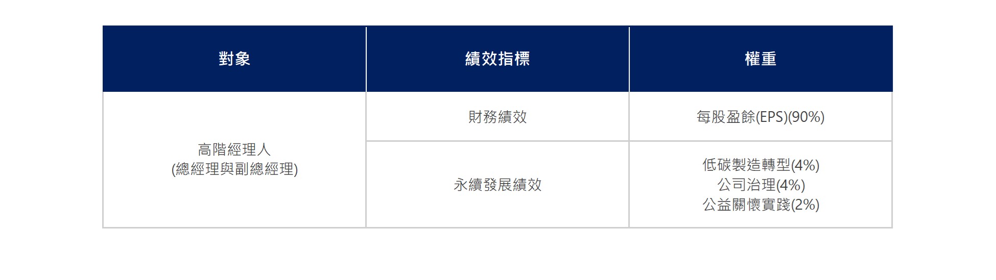 為能設計制度與永續績效連結,激勵高階經理人重視中長期綜合績效表現,並達到永續經營。2025年11月12日董事會通過將永續發展績效納入指標,比重為10%,促使永續發展績效與高階經理人的短期與長期激勵薪酬掛鈎,詳如下表: