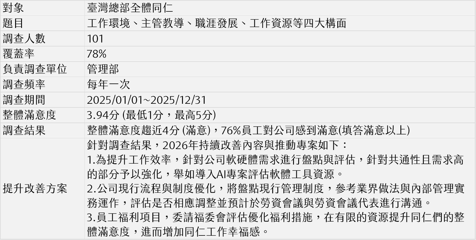 本公司管理部於2025年12月執行2025年員工意見調查,以了解整體員工滿意度,並針對重大問題進行深度溝通和訪談與訂定改善計畫。本次員工意見調查內容包括工作環境、主管教導、職涯發展、工作資源等四大構面,員工滿意度為首次調查,調查對象為台灣總部,台灣總部同仁填答率為78%。同時,超過75%的員工高度認同公司,我們計畫於2027年達成80%台灣總部同仁高度認同公司的目標。